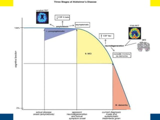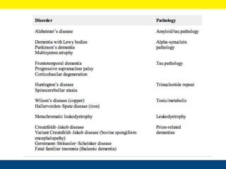 Este documento describe las causas, patología y características clínicas de la demencia. Explica que la demencia se caracteriza por alteraciones de la memoria y otras funciones cognitivas, y puede ser causada por factores degenerativos como la enfermedad de Alzheimer o no degenerativos como accidentes vasculares cerebrales. Luego se enfoca en explicar en detalle la patología y progresión de la enfermedad de Alzheimer, incluyendo la formación anormal de placas amiloides, la deposición de proteína tau, y los biomarc