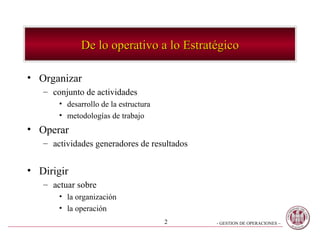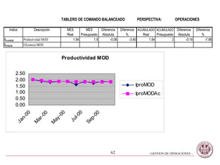 El documento habla sobre la gestión de operaciones y el uso de tableros de comando para medir el desempeño estratégico, operativo y táctico de una organización. Explica que un tablero de comando balanceado integra métricas financieras con indicadores de clientes, procesos internos, aprendizaje y crecimiento. El tablero permite traducir la visión estratégica de la empresa en objetivos medibles y evaluar el progreso hacia esas metas a través de relaciones de causa y efecto.