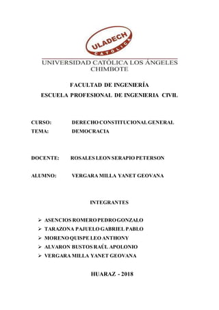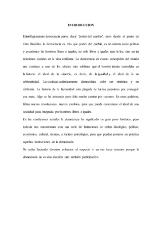 Este documento presenta una introducción a la democracia, incluyendo su etimología y definiciones procedimental y estructural. También describe los componentes clave de la democracia como la división de poderes, derechos de las minorías y mayorías. Finalmente, distingue entre democracia directa e indirecta, y explica las similitudes y diferencias entre democracia y república.