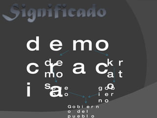 Este documento describe los principios fundamentales de la democracia. Explica que la democracia significa el gobierno del pueblo y se basa en el respeto de la libertad y la dignidad humana. Afirma que en una democracia, el pueblo elige a sus representantes para gobernar, cada provincia elige su propio gobierno, y existe una división de poderes entre el legislativo, ejecutivo y judicial.