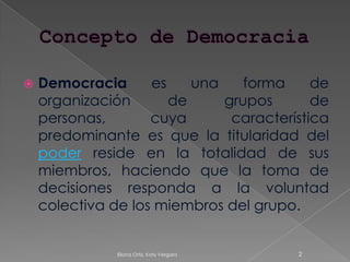 El documento define la democracia como una forma de organización donde el poder reside en la totalidad de los miembros de un grupo y las decisiones reflejan la voluntad colectiva. Explica que hay democracia directa, indirecta o representativa, y participativa. También señala que el término democracia proviene del griego y fue acuñado en Atenas en el siglo V a. C.