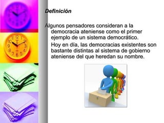 El documento define la democracia y describe sus diferentes formas, componentes y temas relacionados. Explica que la democracia ateniense fue el primer sistema democrático y que hoy existen dos formas principales: directa y representativa. También cubre conceptos como la regla de la mayoría, la socialdemocracia, derechos humanos y temas como la transición a la democracia y las diferencias entre democracia y autocracia o república. Finalmente, sugiere que existe una relación entre mayores niveles de democracia y