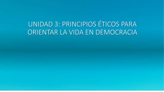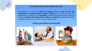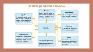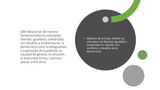 El documento define los conceptos clave de libertad, igualdad y solidaridad y cómo se relacionan con los desafíos de la democracia. Explica que la democracia implica un gobierno del pueblo a través de mecanismos institucionales y que representa valores como la libertad, igualdad, justicia social y respeto a las minorías. También señala que la democracia reconoce la dignidad de todas las personas y que para ser democráticos, debemos respetar la opinión de todos.