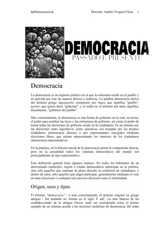 El documento define la democracia como un sistema de gobierno en el que la soberanía reside en el pueblo, ya sea de forma directa o indirecta a través de representantes electos. Explica que la democracia representativa es el tipo más extendido actualmente. También discute argumentos a favor y en contra de la democracia, como la posible ignorancia popular o la "tiranía de la mayoría", y cómo las democracias modernas intentan mitigar estos riesgos a través de mecanismos como las constituciones y la separación de poderes.