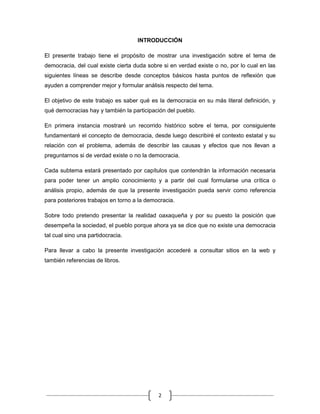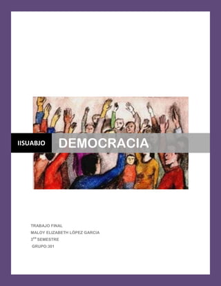 El documento presenta un resumen de los antecedentes históricos de la democracia. Explica que la democracia surgió en la antigua Grecia, donde existían polis gobernadas por reyes o aristócratas, con participación limitada del pueblo. Luego, en Atenas el rey se volvió electivo y de poder limitado. También señala las contribuciones de filósofos como Platón y Aristóteles en la discusión teórica sobre política y derecho, y sus visiones sobre sistemas de gobierno como la dem