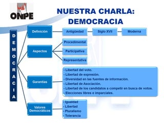 El documento define la democracia como un sistema en el que el poder soberano recae en el pueblo y todos los ciudadanos son políticamente iguales ante la ley. Explica que la democracia moderna se basa en elecciones limpias, participación ciudadana y representación a través de instituciones electas. También destaca valores democráticos como la libertad, igualdad, tolerancia y pluralismo, y señala que construir la democracia en el Perú requiere elegir buenos líderes, respetar los derechos de los demás y prom