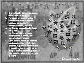 Este documento presenta información sobre un filósofo y científico de la antigua Grecia. Visitó varios lugares para realizar estudios y escribió sobre una variedad de temas incluyendo ética, física y filosofía. Aunque se dice que escribió tanto como Aristóteles, sus obras se perdieron. Consideraba que el hombre era un microcosmos formado por átomos y vacío, y que su destino estaba ligado al cosmos.