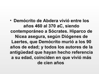 Demócrito fue un filósofo griego del siglo V a.C. que desarrolló la teoría atomista, según la cual todo está compuesto de átomos indivisibles y vacío. Viajó extensamente en busca de conocimiento y escribió más de 70 obras. Explicaba los cambios en la naturaleza y las percepciones sensoriales mediante la combinación y separación de átomos en movimiento en el vacío. Su teoría atomista introdujo el concepto de vacío para permitir el movimiento y superó la negación del cambio de Parm