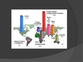 Este documento trata sobre demografía y población. Explica conceptos clave como crecimiento poblacional, densidad poblacional, tasas de natalidad y mortalidad, esperanza de vida, y factores que influyen en la distribución de la población. También analiza la desigual distribución mundial de la población, la concentración urbana que ocurre durante la industrialización, y los estudios poblacionales de Robert Malthus.