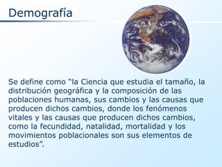 Este documento presenta una introducción a la demografía. Define la demografía como la ciencia que estudia el tamaño, distribución y composición de las poblaciones humanas, así como los cambios en estas y sus causas. Explica los elementos de estudio de la demografía como la fecundidad, natalidad, mortalidad y movimientos poblacionales. También describe los métodos y objetivos de la demografía, así como conceptos e indicadores demográficos clave como la esperanza de vida y tasas de natalidad y mortalidad.