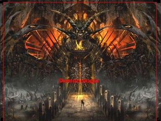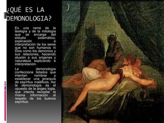 La demonología es el estudio de los demonios y su relación con Dios y los seres humanos según diferentes religiones. Incluye la demonología zoroástrica, judía, cristiana, islámica, budista e hindú, cada una con sus propias concepciones sobre el origen y naturaleza de los demonios. El cristianismo considera a los demonios como ángeles caídos, mientras que el islamismo los ve como jinns rebeldes. La existencia del mal sobrenatural que se opone a Dios ha sido central en el crist