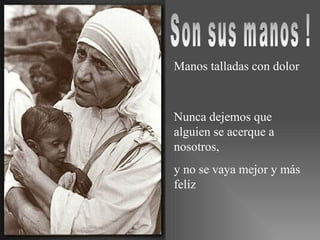 El documento enfatiza la importancia de servir a los demás con amor y alegría. Aconseja no dejar que nadie se vaya sin sentirse mejor y más feliz después de interactuar con nosotros, y que debemos irradiar alegría en nuestras acciones para que otros se sientan amados. Concluye que el fruto final del servicio desinteresado a los demás es la paz.
