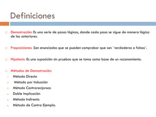 Este documento aborda las demostraciones matemáticas, definiendo conceptos clave como demostración, proposiciones e hipótesis. Se enumeran varios métodos de demostración, incluyendo el método directo, por inducción y contrarecíproco. Además, se subraya la importancia de un argumento deductivo para establecer teoremas en matemáticas.