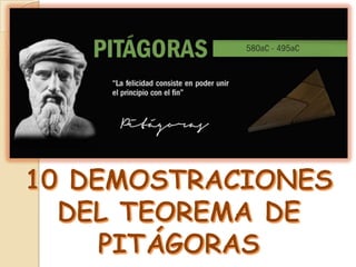 El documento presenta 10 demostraciones del Teorema de Pitágoras, que establece que en un triángulo rectángulo la suma de los cuadrados de los catetos es igual al cuadrado de la hipotenusa. Las demostraciones provienen de diversas fuentes y épocas, incluyendo geometría china antigua, la India del siglo XII, el matemático griego Euclides y el renacentista Leonardo da Vinci.