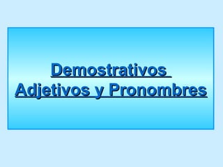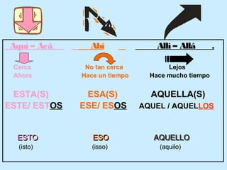 Este documento presenta los demostrativos en español, incluyendo adjetivos y pronombres. Explica que los adjetivos demostrativos como "este", "esa" y "aquel" se colocan junto al sustantivo sin acento, mientras que los pronombres demostrativos como "éste", "aquélla" y "ésa" se colocan lejos del sustantivo con acento. También define el uso de los demostrativos para indicar distancia y tiempo.