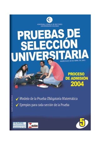 Este documento presenta un modelo de prueba de matemática que consta de 35 preguntas distribuidas en 4 ejes temáticos: números y proporcionalidad, álgebra y funciones, geometría y probabilidad y estadística. Incluye instrucciones específicas para responder la prueba y una lista de símbolos matemáticos. El propósito de la prueba es evaluar la capacidad de los estudiantes en reconocer conceptos matemáticos, identificar y aplicar métodos para resolver problemas, y analizar y evaluar información
