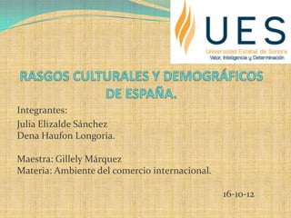 El documento presenta información sobre la cultura, costumbres, religión, idiomas, fiestas y población de España. La mayoría de la población española es católica y se habla principalmente castellano aunque existen otras lenguas regionales como el catalán y el vasco. Las fiestas más populares incluyen San Fermín en Pamplona y La Tomatina en Buñol.