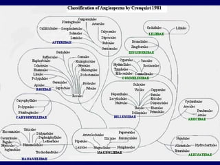 Las angiospermas se caracterizan por tener flores y frutos protegidos, semillas nunca protálicas, fecundación doble y estructura avanzada del gametófito. Son el grupo dominante actualmente con 250,000 especies diversas en forma, estructura y hábitat. Las ninfeáceas incluyen alrededor de 100 especies acuáticas con grandes rizomas, hojas flotantes y flores solitarias vistosas.