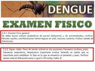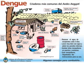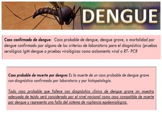 El virus del dengue pertenece a la familia Flaviviridae y género Flavivirus. Es transmitido por la picadura del mosquito Aedes aegypti y causa una enfermedad que presenta tres etapas: febril, crítica y de recuperación. La mortalidad se debe principalmente a la falta de atención médica adecuada y la prevención consiste en eliminar los criaderos de mosquitos y el control con insecticidas.
