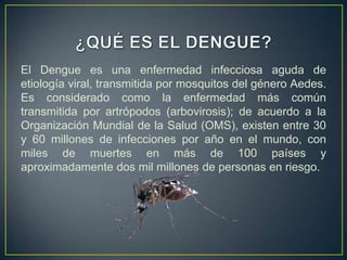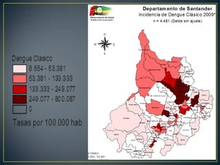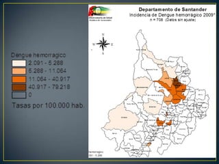 El documento describe la historia natural, situación y prevención del dengue en Santander, Colombia. Explica que el dengue es una enfermedad viral transmitida por mosquitos del género Aedes, con síntomas que incluyen fiebre alta, dolor muscular y de articulaciones, y en algunos casos salpullido, sangrado de encías y vómitos. También describe las medidas de prevención primaria como la eliminación de criaderos de larvas y el uso de repelentes, y la importancia del diagnóstico temprano y tratamiento.