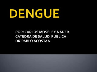 El documento resume que el dengue es una enfermedad viral aguda transmitida por la picadura de los mosquitos Aedes aegypti y Aedes albopictus, que se crían en agua estancada. El dengue es causado por cuatro serotipos del virus del dengue y sus síntomas incluyen dolor de cabeza, dolor detrás de los ojos, dolores musculares y articulares, cansancio y exantema, que puede estar acompañado de hemorragias.