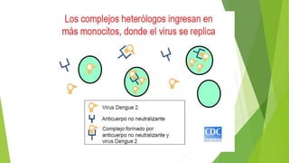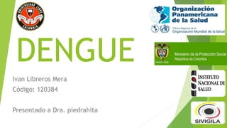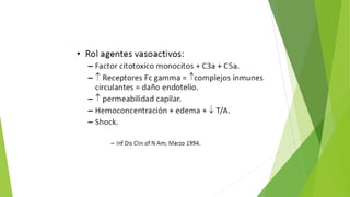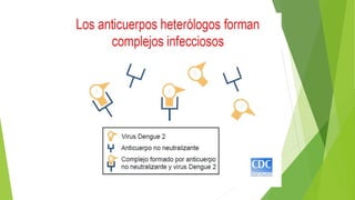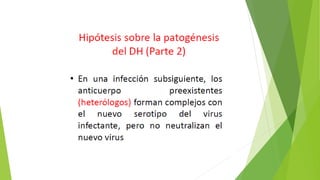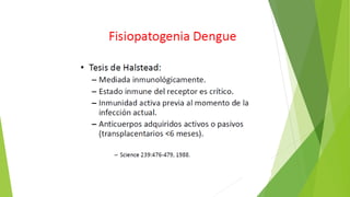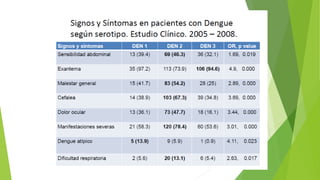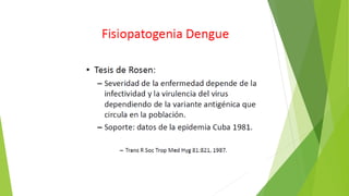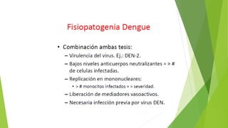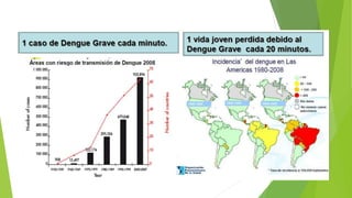 El documento describe la epidemiología del dengue en Colombia. Explica que Colombia se encuentra en una situación "hiperendémica" de dengue, con más de 126,500 casos reportados en 2013 y 3,500 casos en 2014. Los departamentos más afectados son Santander, Valle, Norte de Santander, Huila, Tolima y Antioquia, los cuales representan el 50% de los casos totales en el país.