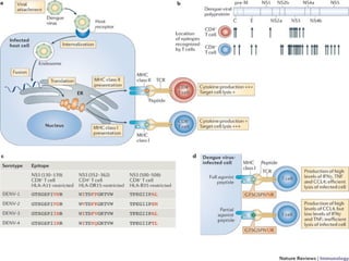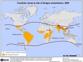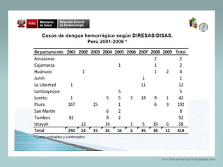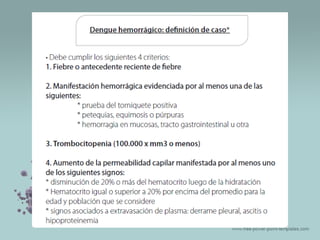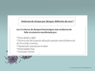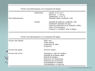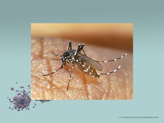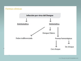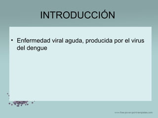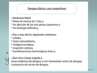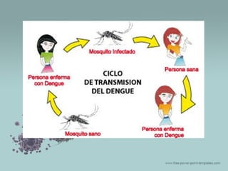 1) El dengue es una enfermedad viral aguda transmitida por mosquitos del género Aedes, principalmente el Aedes aegypti. 2) Presenta cuatro serotipos y causa fiebre, dolores musculares y articulares, y en algunos casos hemorragias. 3) No tiene tratamiento específico, solo medidas de soporte y prevención de complicaciones como la deshidratación.
