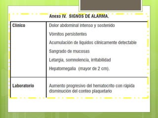 Este documento describe la enfermedad del dengue, incluyendo su replicación y transmisión por mosquitos, las diferentes fases de la enfermedad (febril, crítica y de recuperación), y los signos de alarma. También clasifica el dengue en tres grupos (A, B y C) dependiendo de la gravedad de los síntomas, y proporciona guías para el manejo del choque, hemorragias, sobrecarga de volumen y dengue en embarazadas.