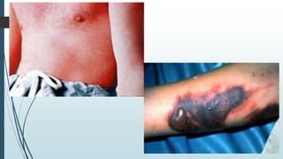 Este documento describe el dengue, un virus transmitido por mosquitos que causa fiebre y hemorragias. Explica que existen 4 serotipos del virus y que la infección con uno solo proporciona inmunidad a ese serotipo pero no a los demás. Se transmite a través de la picadura del mosquito Aedes aegypti y su periodo de incubación es de 3 a 8 días. Los síntomas incluyen fiebre alta, dolor de cabeza y muscular, y en casos graves puede causar hemorragias. El diagnóstico se realiza clínic