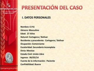 Este documento presenta el caso de un paciente masculino de 27 años que ingresó al hospital con dolor abdominal, fiebre y disfunción renal. El paciente tenía antecedentes de abuso de sustancias y presentaba signos clínicos de sepsis severa. Los exámenes mostraron elevación de enzimas hepáticas y CPK, sugiriendo leptospirosis. El paciente fue hospitalizado en cuidados intermedios para recibir antibióticos y hemodiálisis, dada su insuficiencia renal aguda. Su pronóstico se reportó como reservado