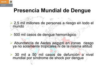 Este documento proporciona información general sobre la fiebre por dengue. Explica que el dengue es transmitido por mosquitos y causa una enfermedad febril que puede variar desde asintomática hasta grave. Describe las fases de la enfermedad, incluidas la fase febril, crítica y de recuperación, y los signos de alarma que indican un posible dengue grave. También cubre el diagnóstico, manejo y tratamiento del dengue no grave y grave.