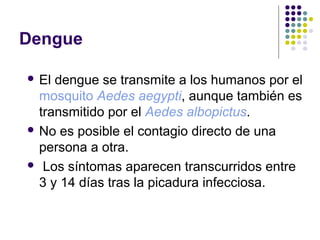 Este documento resume la enfermedad del dengue, causada por el virus del dengue transmitido por mosquitos Aedes. Describe los síntomas, características del mosquito vector, evolución de la enfermedad y clasificación. Además, provee recomendaciones para el tratamiento y manejo de pacientes con dengue, dependiendo de si presentan o no signos de alarma.