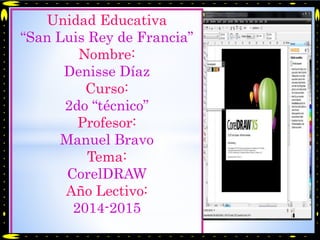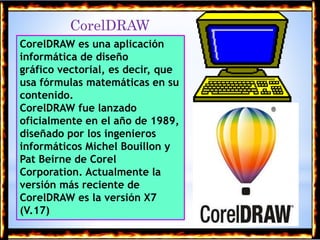 Este documento proporciona información sobre CorelDRAW. CorelDRAW es un programa de diseño gráfico vectorial lanzado en 1989 por Corel Corporation. Permite el dibujo, maquetación de páginas y publicación web, y ofrece herramientas para efectos como brillo y contraste. El documento describe algunas características y partes principales del programa como el área de trabajo y la caja de herramientas.
