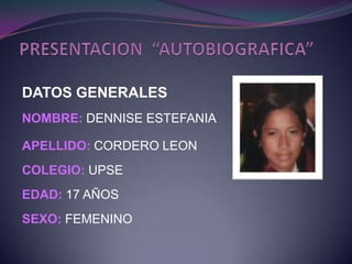 Dennise Cordero León es una estudiante de 17 años que se graduó recientemente de la secundaria en el colegio UPSE. Obtuvo buenas calificaciones a lo largo de sus estudios con el apoyo de sus padres. Ahora busca continuar sus estudios para obtener un título en ingeniería de administración de empresas y ayudar a sus padres en el futuro.