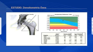 La densitometría ósea es la técnica diagnóstica de elección para evaluar el riesgo de osteoporosis y fracturas. El documento explica que la densitometría ósea mide la densidad mineral ósea del fémur y la columna lumbar de manera no invasiva y precisa. El valor clave es el T-Score, que indica la desviación del valor de la densidad ósea de una persona en comparación con el promedio de personas jóvenes sanas, y se usa para estratificar el riesgo de fractura según los criterios de la
