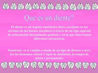 Este documento trata sobre las diferentes denticiones en los seres humanos. Explica las denticiones primaria, mixta y permanente, incluyendo cuándo aparecen los diferentes tipos de dientes y su función. También describe la anatomía básica de los dientes y su morfología, así como la importancia de mantener una buena dentición a lo largo de la vida.