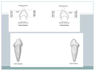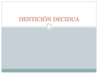 El documento proporciona información detallada sobre la anatomía dental de los dientes deciduos, incluyendo las fechas de calcificación, erupción y formación de la raíz, así como las mediciones y características de cada diente. Se describen las caras vestibular, lingual, mesial, distal e incisal de cada diente, con énfasis en sus diferencias con los dientes permanentes correspondientes.