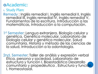 Este documento presenta un plan de estudios para la carrera de odontología en la Universidad Tecnológica (TEC) y la Universidad Nacional (UNI). Detalla los requisitos, costos y duración de cada programa, así como las opciones de prácticas profesionales y empleo después de graduarse. También describe las características personales requeridas y los beneficios y desafíos de la profesión.