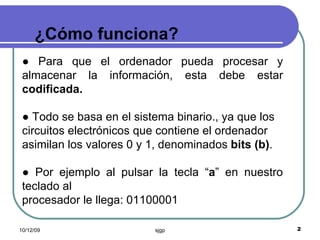 El documento explica cómo funciona un ordenador a nivel básico. Describe que la información se codifica en bits y bytes para su procesamiento y almacenamiento. Explica los principales elementos de un ordenador como el procesador, las memorias RAM, ROM y caché, y las unidades de almacenamiento como el disco duro, las unidades ópticas y las memorias flash.