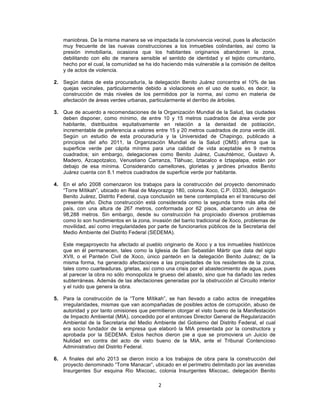 Este documento presenta una denuncia ciudadana contra quien resulte responsable por proyectos de construcción en la delegación Benito Juárez del Distrito Federal que han causado daños ambientales y afectaciones a la calidad de vida de los residentes. Se describen irregularidades en la aprobación de permisos y manifestaciones de impacto ambiental para la construcción de la Torre Mítikah, la Torre Manacar y un deprimido vehicular en Insurgentes-Mixcoac que han derivado en la tala de árboles, hundimientos, tráfico y escase