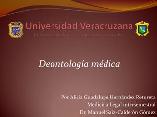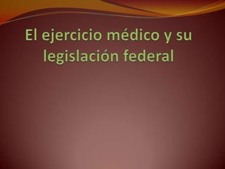 El documento resume los conceptos clave de la deontología médica. Explica que la deontología estudia los deberes y derechos de los médicos desde una perspectiva ética y legal. También describe elementos del ejercicio médico como el acto médico, el sujeto activo y las circunstancias. Finalmente, resume algunos artículos clave de la Ley General de Salud de México y del Código Penal Federal que regulan el ejercicio legal e ilegal de la medicina.