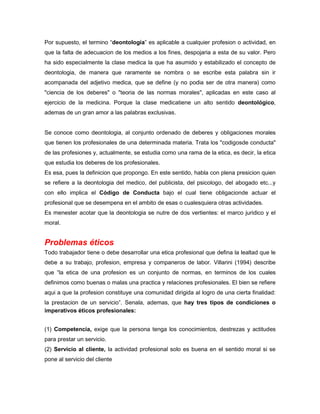 La deontología se refiere al estudio de los deberes y obligaciones morales de las profesiones. Fue acuñado por Jeremy Bentham para describir los deberes basados en la utilidad. Aunque originalmente se refería a deberes profesionales, hoy en día también implica normas morales. Los problemas éticos surgen cuando los profesionales no cumplen con sus deberes de competencia, servicio al cliente y solidaridad. Algunos problemas comunes incluyen el abuso de poder, los conflictos de intereses y la corrupción. Para