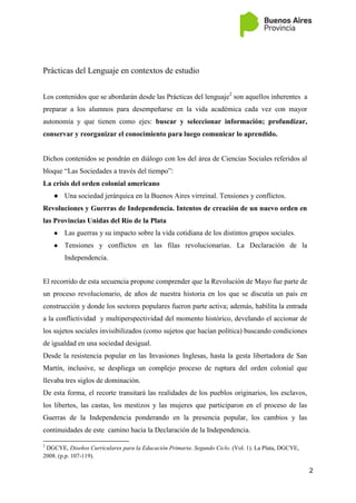 Este documento presenta una propuesta didáctica para enseñar sobre la participación de los sujetos sociales invisibilizados en las luchas por la independencia argentina a través de prácticas del lenguaje. La secuencia incluye actividades como observación de imágenes, toma de notas colectivas sobre documentales, lectura de textos y producción de resúmenes y discursos. El objetivo es que los estudiantes aprendan sobre este periodo histórico desde diferentes perspectivas a través de la interacción con diversas fuentes y la