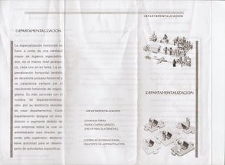 El documento habla sobre la departamentalización. Explica que la departamentalización, también conocida como especialización horizontal, implica la creación de más departamentos especializados en el mismo nivel jerárquico para llevar a cabo tareas específicas. Cada departamento se encarga de un área, división o segmento distinto de la empresa sobre el cual un administrador tiene autoridad para dirigir actividades específicas. La departamentalización se caracteriza por el crecimiento horizontal del organigrama de una empresa.