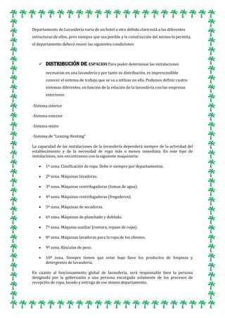 El documento describe el departamento de lavandería de un hotel, incluyendo las áreas de trabajo requeridas, la maquinaria utilizada, los procesos de lavado, secado y planchado, y el personal involucrado. El departamento se encarga de lavar la ropa de huéspedes e internamente, y consta de zonas para clasificar, lavar, centrifugar, secar, planchar y almacenar productos de limpieza. El personal incluye jefes de lavandería y valets, así como planchadoras.