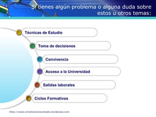 El documento del departamento de orientación del IES Hermanos Machado ofrece recursos sobre técnicas de estudio, toma de decisiones, convivencia, acceso a la universidad y salidas laborales. Incluye enlaces a su sitio web para más información detallada sobre cada tema. Se abordan estrategias para mejorar habilidades académicas y profesionales, así como consejos para una convivencia saludable.