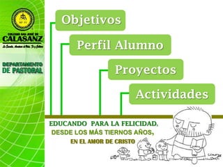 El documento presenta los objetivos y proyectos del Departamento de Pastoral del Colegio San José de Calasanz, que busca formar a la comunidad educativa a través de la fe y los valores cristianos, y proponer actividades como oratorios, retiros espirituales y acompañamiento sacramental.
