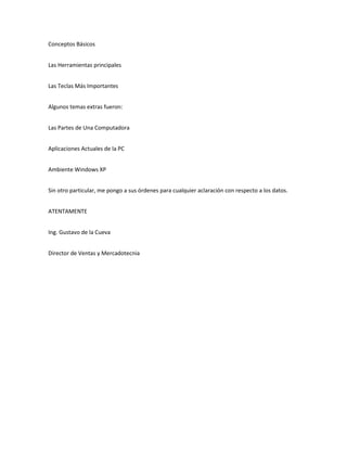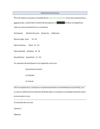 El resumen detalla los resultados de los cursos de capacitación a los que asistió el personal de ventas. Incluye la lista de participantes con sus nombres, cursos, asistencias y calificaciones. Explica que los requisitos para los próximos cursos son conocimientos previos, un disquete y un manual. Además, indica que para recibir la constancia se debe presentar una identificación oficial y que esta se entregará hasta dos meses después de terminado el curso.