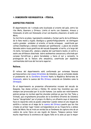 El documento describe la geografía, clima, hidrografía, vegetación, historia, aspectos políticos, económicos y ambientales del departamento de Vichada, Colombia. Se destaca que Vichada tiene extensas llanuras, clima cálido y lluvioso, ríos como el Meta y Orinoco, vegetación de sabana, y economía basada en la ganadería, pesca y minería. Históricamente estuvo habitado por grupos indígenas y actualmente enfrenta desafíos de pobreza y medio ambiente.