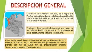 El departamento de Chocó se localiza en el noroeste de Colombia, en la región del Pacífico. Tiene costas en los océanos Pacífico y Atlántico y limita con Panamá. Su clima es intertropical lluvioso y recibe más de 9.000 mm de lluvia anuales. Sus principales actividades económicas son la agricultura, la minería, la ganadería y el turismo. Algunos de sus platos típicos son el sancocho de mulata y el arroz atollado. Ha dado importantes escrit